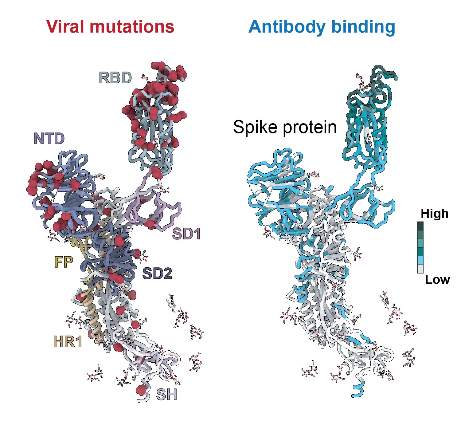Above: Cartoon model of the SARS-CoV-2 spike protein showing the different regions (or domains) that are associated with known viral mutations and antibodies can recognize…