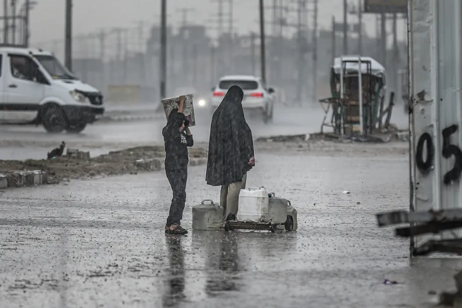 Palestinians struggle to survive under harsh weather conditions at makeshift tents as heavy rainfall and strong winds damage the shelters amid Israeli attacks at the Bureij Refugee camp in Gaza City, Gaza on December 27, 2025. [Adem Bilal - Anadolu Agency]