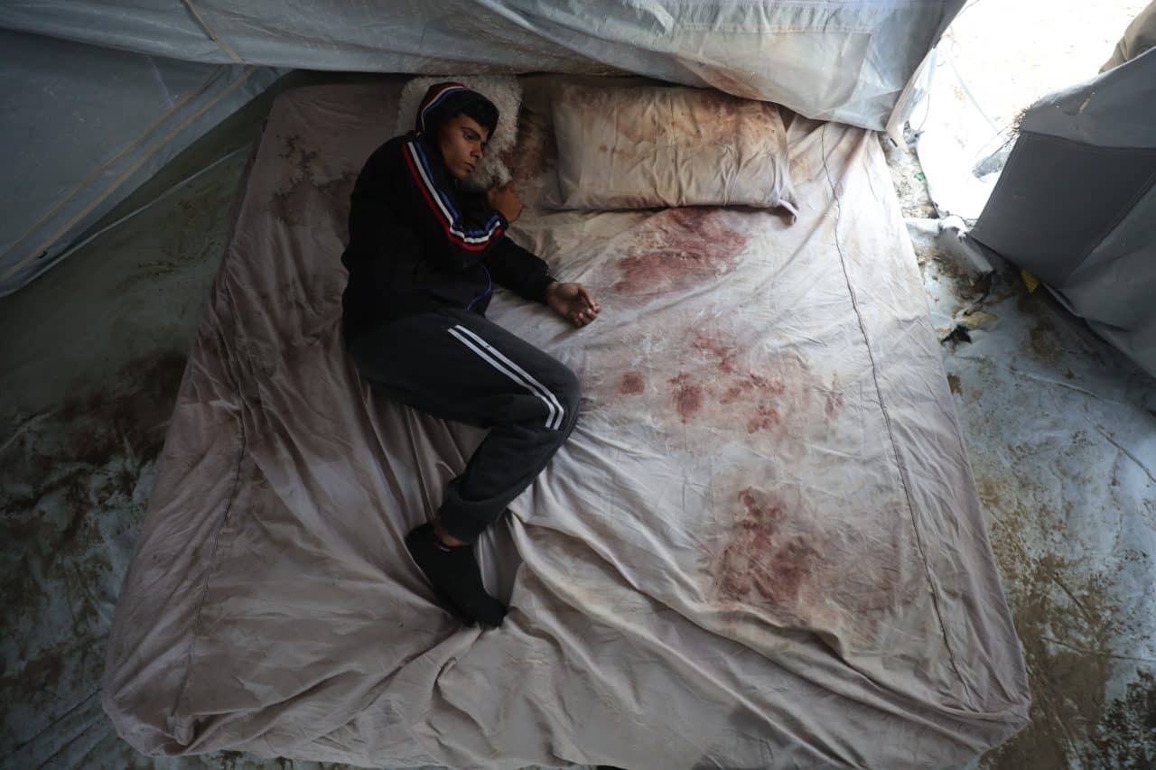 Ahmad Abu Saada, 21, refuses to clean the blood from his mattress. He lies down beside it, pale red against white. Ahmad sleeps here every night, refusing to leave the tent. The mattress is large, made for two, but he only lies down on one…