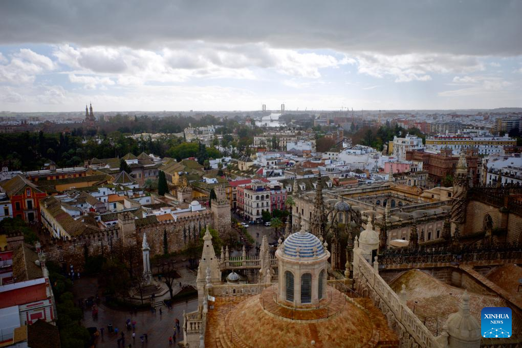 This photo taken on Feb. 6, 2026 shows clouds above Seville, Spain. A wave of extreme weather has swept across Europe in recent weeks, as powerful Atlantic storms battered southern countries with flooding, while Arctic cold gripped parts of…