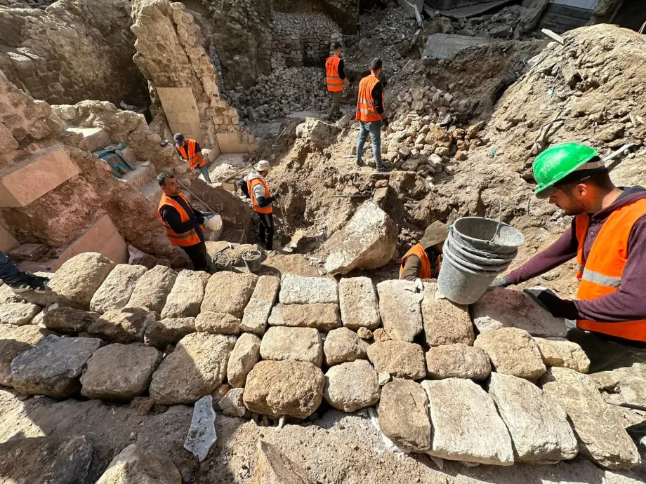 Workers sort and arrange ancient stones during efforts to rebuild the 900-year-old Al-Samra Bathhouse, damaged by Israeli bombardment, in Gaza City’s Old City, Gaza on February 12, 2026. [Mohammed…
