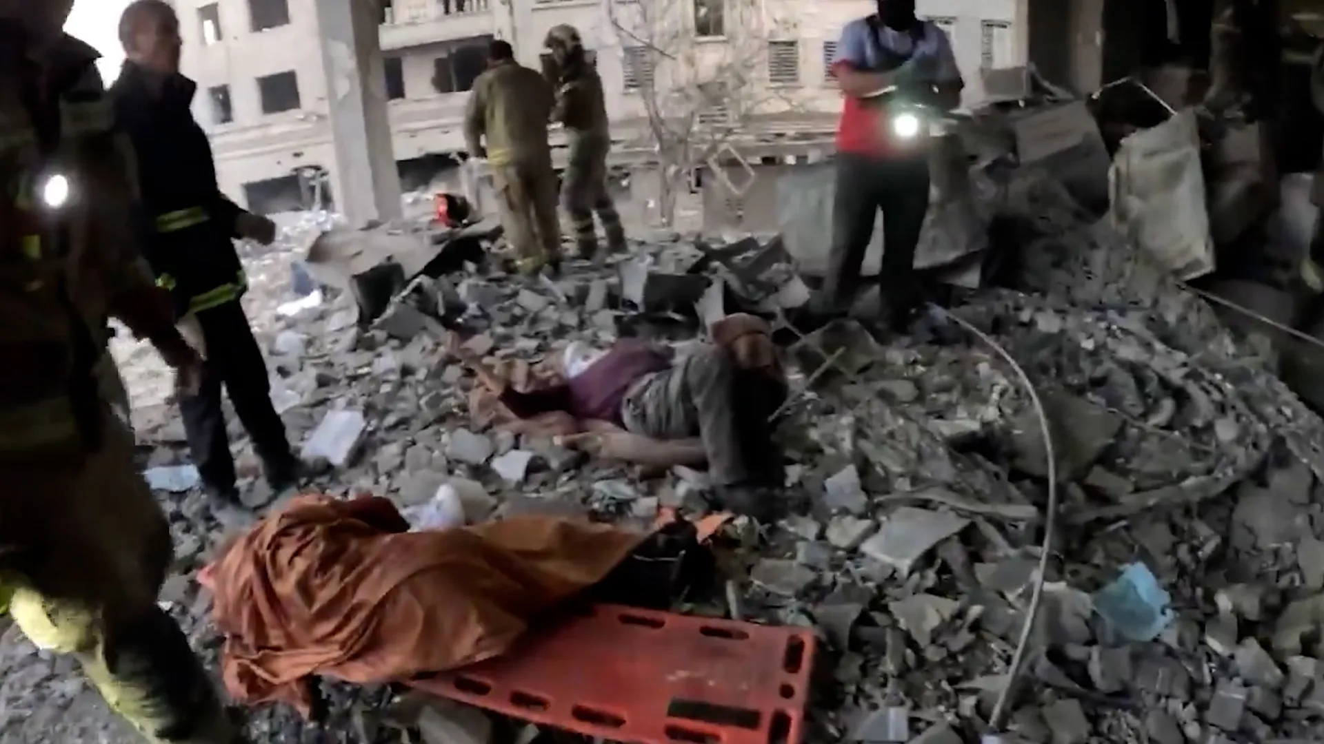 Footage shows Iranian Red Crescent Society rescuers and firemen saving two civilians from underneath the rubble in western Tehran, following US-Israeli strikes.
