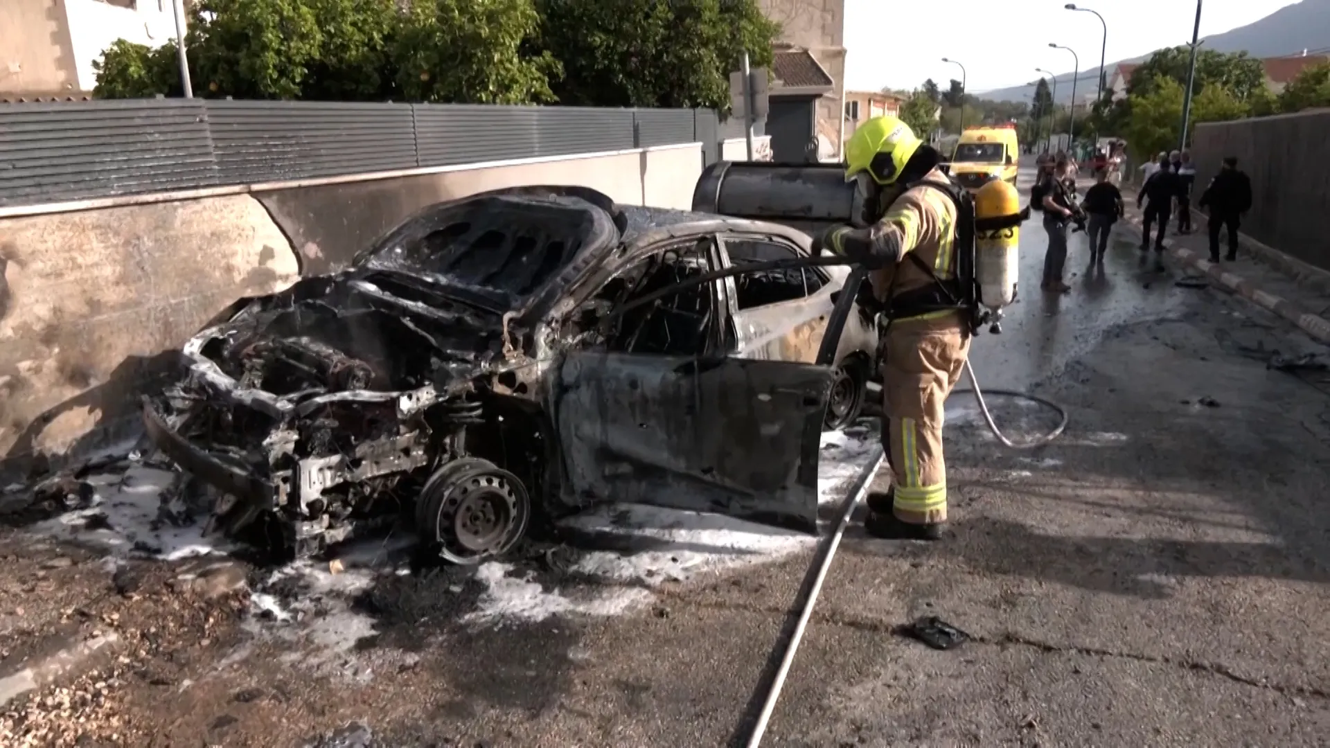 Firefighters worked to extinguish a fire after a rocket attack from Hezbollah hit Kiryat Shmona in northern Israel. No casualties were reported. The strike came hours before US President Trump’s announcement of a Lebanon-Israel…